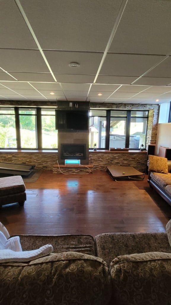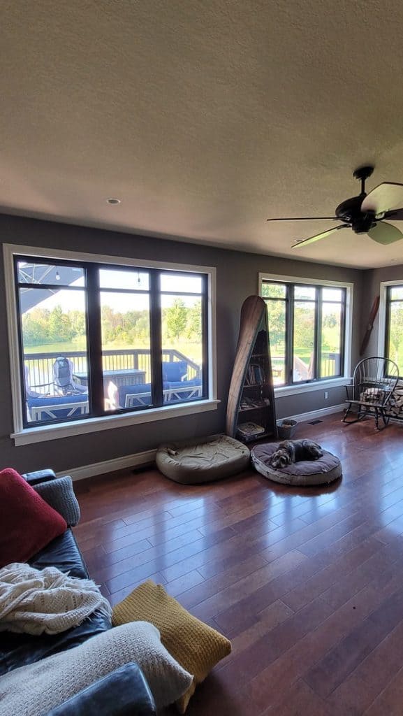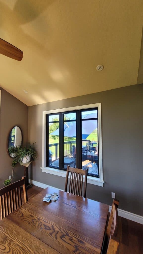 In this project, we replaced all the windows, entry doors, and patio doors in this home. The original doors and windows had white frames. The black in and out with the white interior trim really give a wow factor to this home!